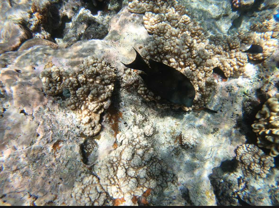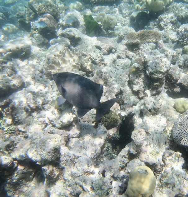I was just snorkeling out away from the group when this guy showed up to check me out. He swam around me and I followed him for about 30 sec. Super cool seeing him cruise in and survey the reef. Everyone eventually saw him and he took off.