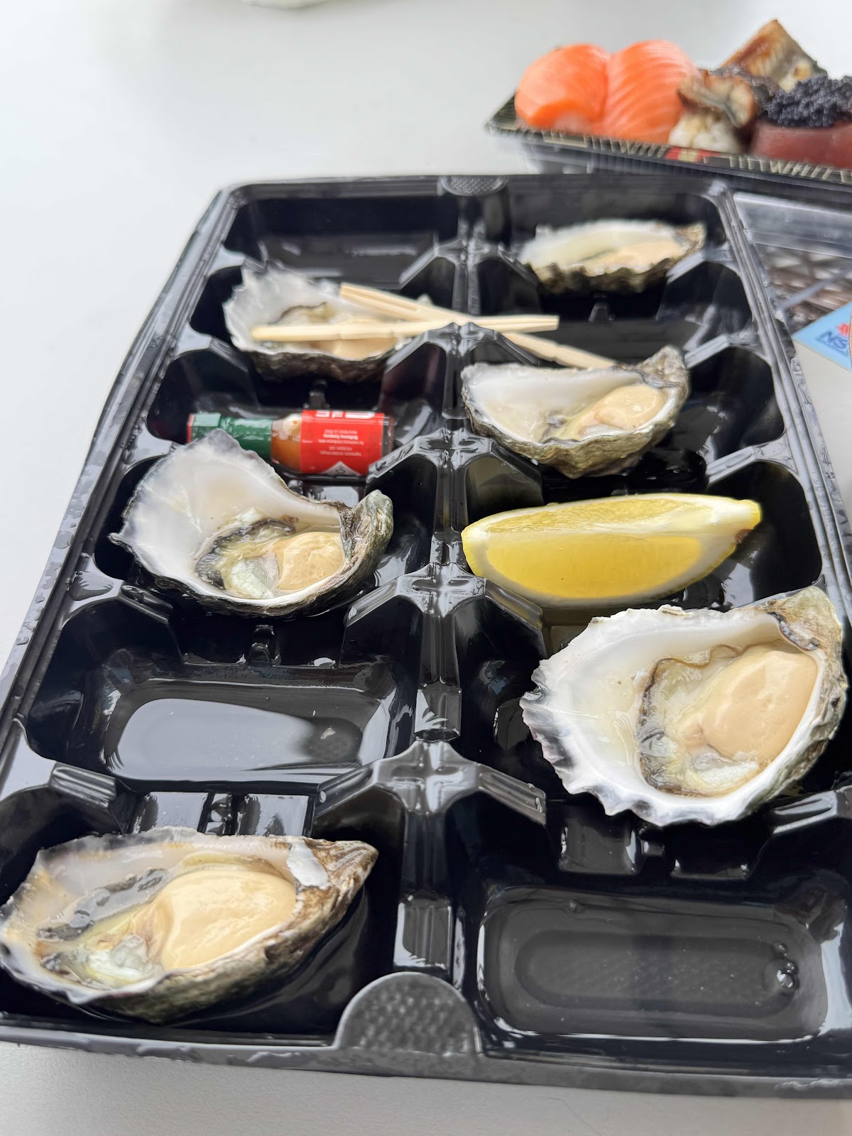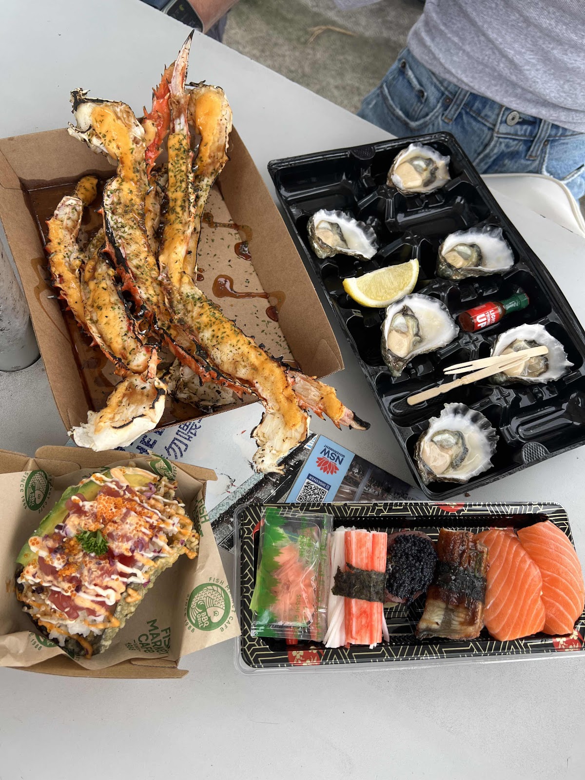 The selections: tuna taco, crab legs, Sydney Rock Oysters and mixed sushi boxes