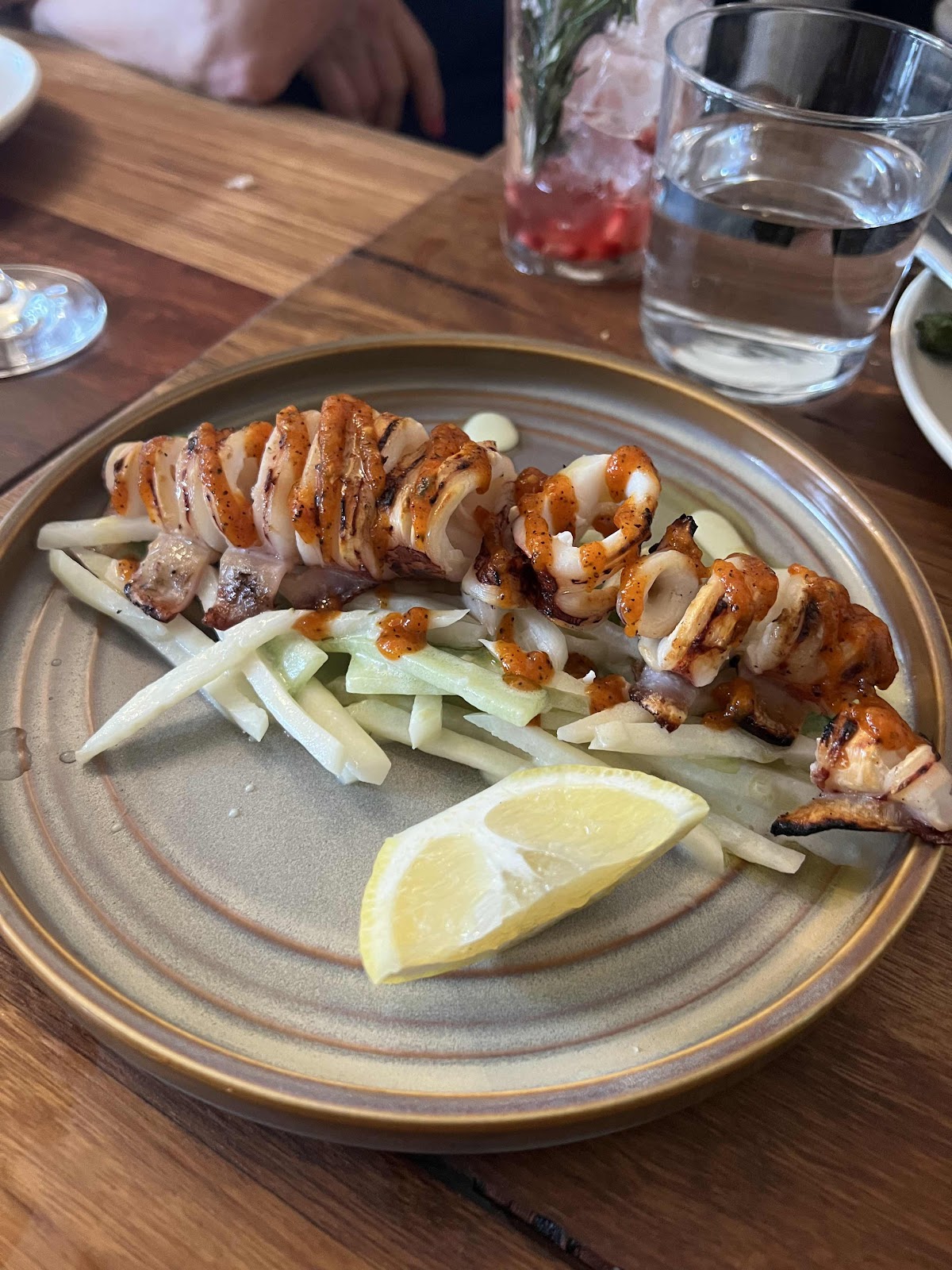 Squid on a bed of Kohlrabi with a fermented pomegranate sauce.