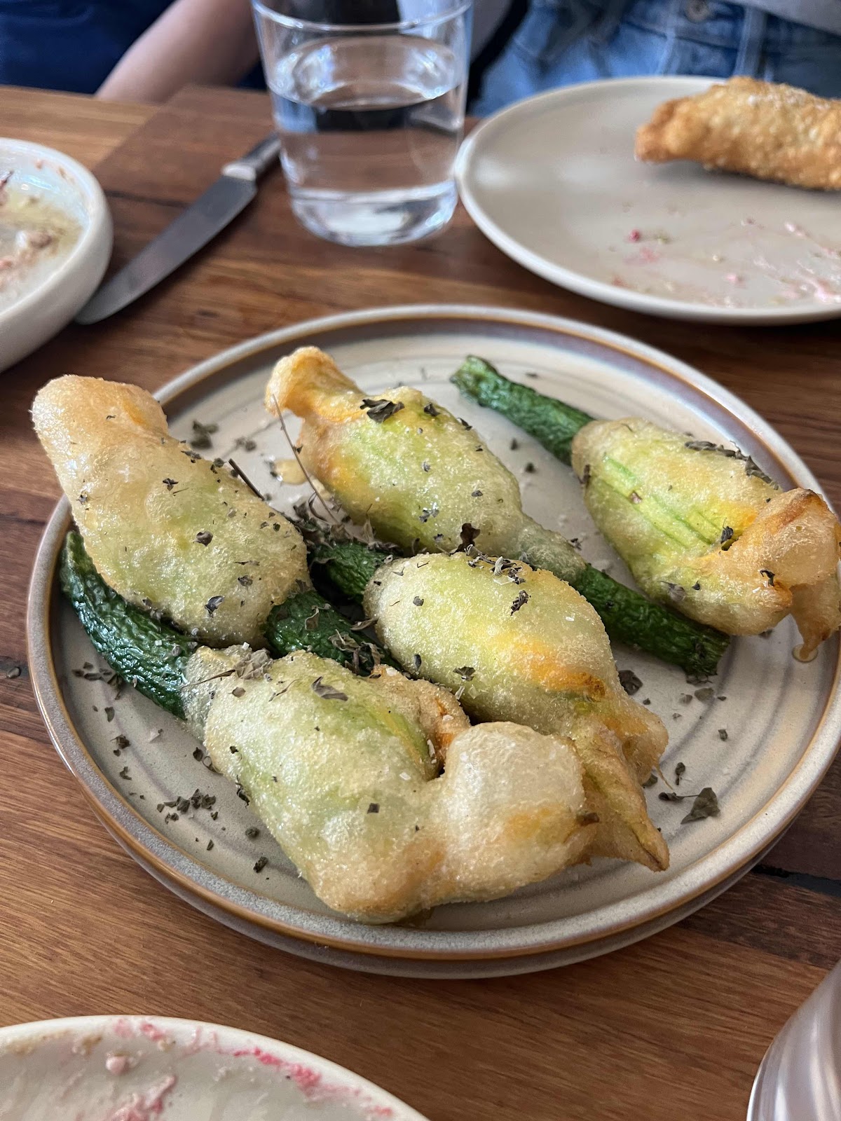 Zucchini flowers, stuffed with goat cheese, fried and drizzled with honey.
