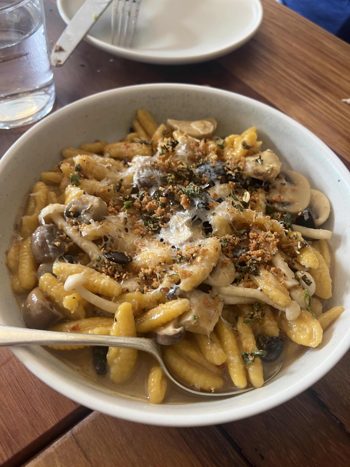 Gnocchi with 2 types of mushrooms and a light peanut sauce.